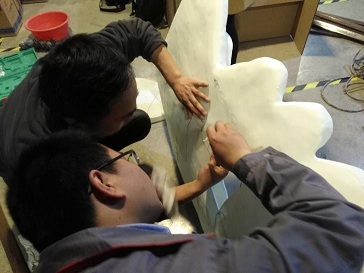 組裝也不是那么輕松的黏在一起就行了的,我們要考慮到最終的效果和在運(yùn)輸過(guò)程之后絕對(duì)的安全,我們先做了一個(gè)鋼結(jié)構(gòu)支架,然后將這數(shù)十個(gè)模塊固定到支架上去。利用數(shù)模分割是設(shè)置的鏈接結(jié)構(gòu)和強(qiáng)力膠水,完成拼接組裝,最后修復(fù)表面的縫隙。